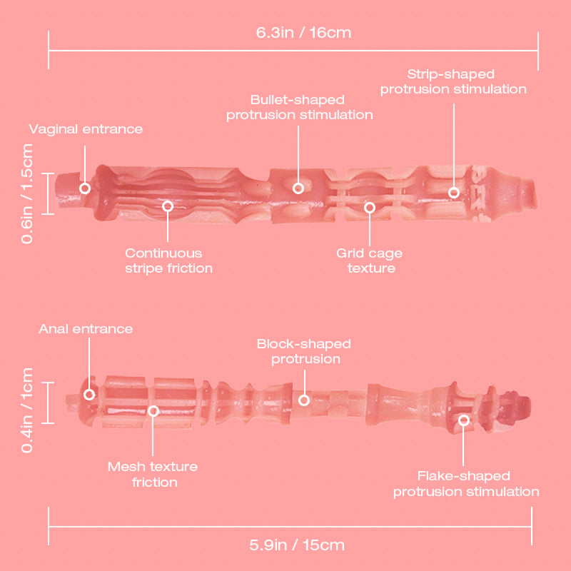 The tunnel is lined with tight, spiraled textures, bumps, and stimulating structures, making every thrust feel like being licked, bitten, and sucked. Each penetration feels as though she’s greedily draining you dry.